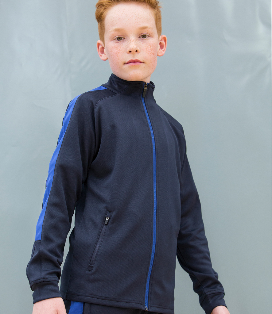 100% polyester interlock. Funnel neck. Full length contrast zip. Contrast outer sleeve panels. Two front zip pockets. Semi-automatic lock zip sliders on all zips. 1x1 ribbed cuffs.